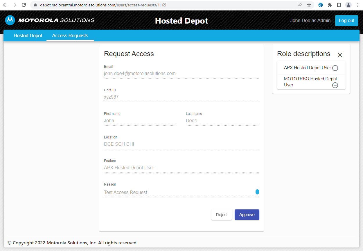If the request status is "New", you will be able to Reject or Approve a specific request, which means granting or rejecting access to Depot Tool for the user who created this request.